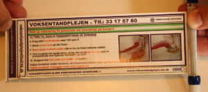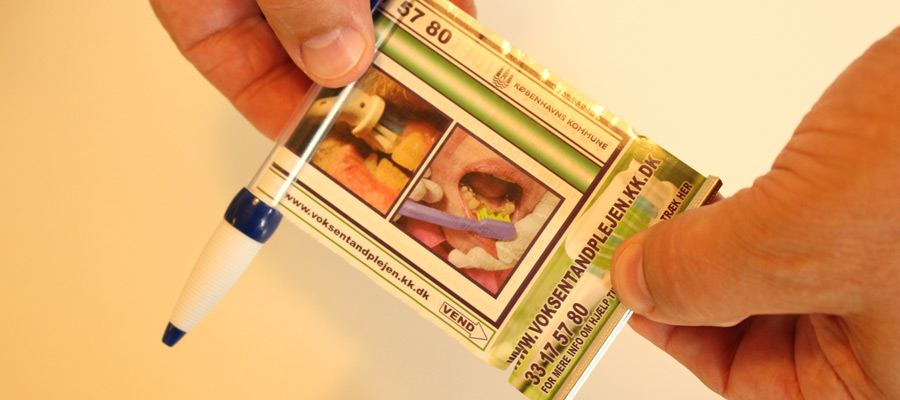 Vores ‘kuglepen med actionkort’ kombinerer brugerens behov for et skriveredskab med et udtrækkeligt actionkort om de 10 trin til den daglige tandpleje af ældre borgere. Brugeren har således altid actionkortet med sig og får løbende en “reminder” om tandpleje af borgeren og hjælper den nye eller usikre bruger med at sikre, at alle elementer af den daglige tandpleje bliver ydet.